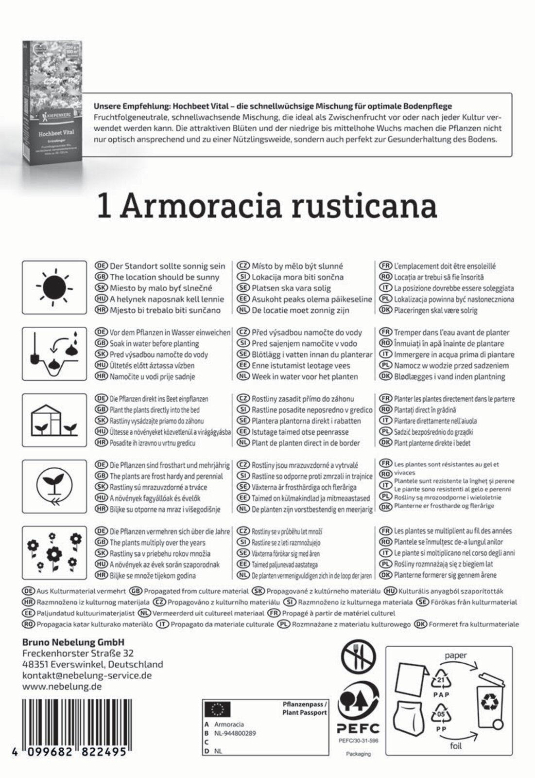 Mehrjährige Staude mit aromatisch scharfen und essbaren Wurzeln. Die Wurzel der Meerrettichpflanze wird als Gemüse, Gewürz oder in der Pflanzenheilkunde (Hilfreich bei Erkältungen und Infektionen) verwendet. Die Anzucht von Meerrettich im Garten lohnt sich, denn nur frisch ausgegrabene Stangen enthalten noch alle Aromastoffe und entfalten in der Küche ihre feine Schärfe. In tiefgründigen und humosen Böden bildet er besonders schöne und geschmacksintensive Stangen. Kübel- oder Freilandkultur möglich. Ernte im selben Jahr der Anpflanzung möglich.